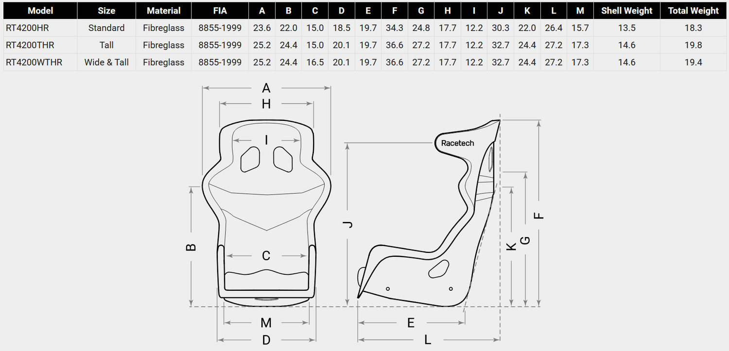 With increased rib support and enhanced head restraint foaming, the new RT4200 Series utilizes the widely-respected RT4100 shell geometry but makes improvements in the areas of comfort and safety. The RT4200 is closer in feel through the rib and torso area to our retired RT4009HR Series. Racetech signature features such as back-mounting, pronounced thigh support, a molded base cushion, parallel sides, and flush bosses for ease of mounting are all present, making this seat series hard to beat. Like all Racetech seats, these lightweight, resin-infused shells are crafted in Wellington, New Zealand. The RT4200 series comprises three sizes all with FIA 8855-1999 approval. For larger drivers, the RT4200THR is 60mm taller and the RT4200WTHR is both 60mm taller and 40mm wider.